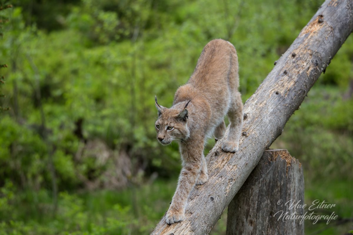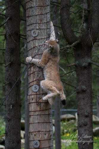 Dann aber kam die Zeit der Fütterung und nach und nach kamen die Tiere aus ihren Verstecken hervor. Während der Fütterung konnte man sich auch von den Kletterkünsten der Luchse überzeugen. Motiviert durch ein „Leckerli“ schaffte es ein Luchs an einem Baumstamm bis in 6 Meter Höhe. Außerdem übertrug eine Kamara Bilder von den neu geborenen Luchsen aus ihrer Höhle.